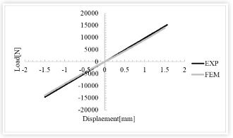 bushing stiffness curve (force-displacement curve) ကို စမ်းသပ်မှုရလဒ်များနှင့် နှိုင်းယှဉ်ပြီး တည်ထောင်ထားသော FEM မော်ဒယ်၏ တရားဝင်မှုကို ပိုမိုသက်သေပြပါသည်။ ပုံမှတွေ့မြင်နိုင်သည်- ပစ္စည်းစမ်းသပ်နမူနာများမှဖော်ထုတ်ထားသော hyperelastic ဘောင်များကိုအသုံးပြု၍ ခွဲခြမ်းစိတ်ဖြာခြင်းသည် load-displacement diagram ပေါ်ရှိ စမ်းသပ်မှုနှင့် ခွဲခြမ်းစိတ်ဖြာမှုရလဒ်များကြား ကောင်းမွန်ညီညွတ်မှုကို သရုပ်ပြသည်။